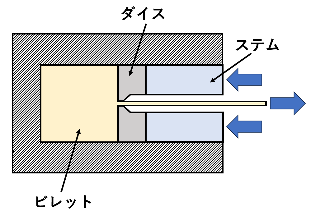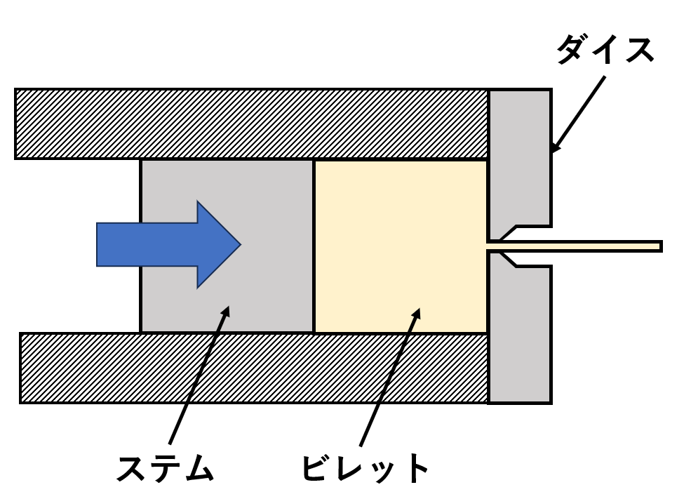 押出加工は、ビレットと呼ばれる金属塊をコンテナという強固な容器に装填し、その一端に設けられたダイスと呼ばれる金型の穴に向かって、ラムと呼ばれるピストンで高圧力を加えて押し出すことで、ダイスの穴形状と同一の断面を持つ長い製品を成形する塑性加工法です。英語ではエクストルージョンと呼ばれます。