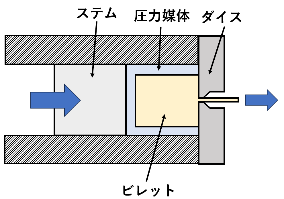 ビレットとコンテナの間に液体(潤滑油など)を介在させ、ラムでその液体を加圧することで、液圧によってビレットをダイスから押し出す方式です。