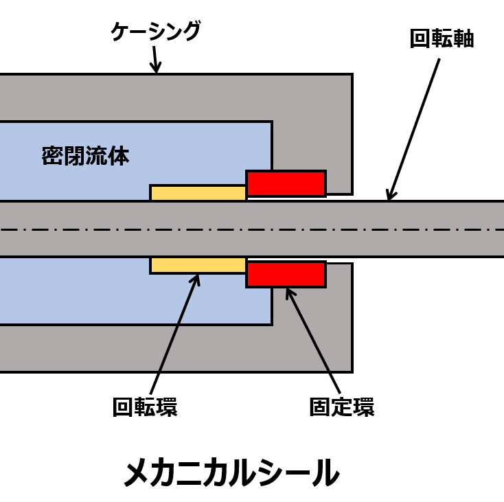 メカニカルシールの基本構造は軸と一緒に回転する回転環と、ケーシング側に固定されて動かない固定環の二つのリングから構成されます。これら二つのリングの接触面を摺動面あるいは密封面と呼びます。