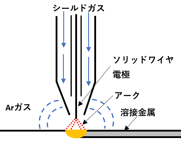 一般的に半自動溶接と呼ばれるカテゴリーに属し、自動送給されるワイヤを電極として、母材との間にアークを発生させ、その熱で母材とワイヤを溶融させて接合します。手溶接と比較して高い溶着速度と深い溶込みが得られるため、生産性が極めて高いプロセスです。しかし、その背後にはプラズマ物理、電磁気学、金属材料学といった高度な物理現象が複雑に関与しています。