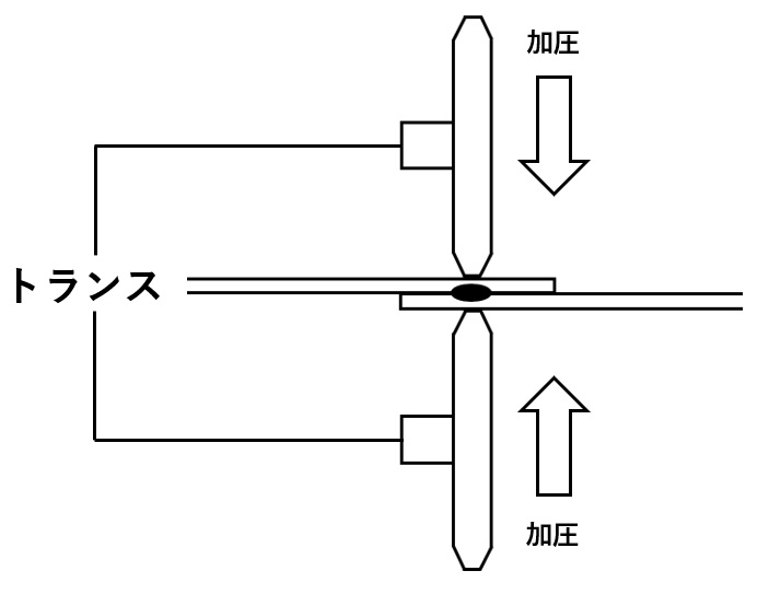 電極輪を通じて数千ニュートンから数万ニュートンの力を安定して加える必要があります。エアシリンダーや油圧シリンダーが用いられますが、近年ではサーボモーターを用いた電動加圧方式が増えています。電動式は、溶接中の電極の沈み込みに合わせて追従制御ができるため、散りの発生を抑え、安定したナゲット形成に寄与します。