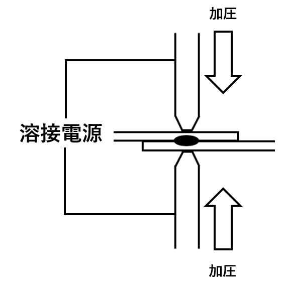 スポット溶接は、接合したい二枚の金属板を重ね合わせ、一対の電極で加圧しながら、極めて大きな電流を短時間流すことで、その接触部に発生する抵抗熱を利用して、金属を局部的に溶融させ、点状に接合する抵抗溶接の一種です。
